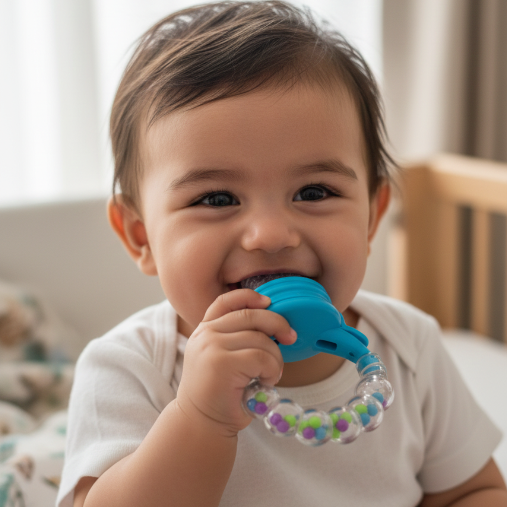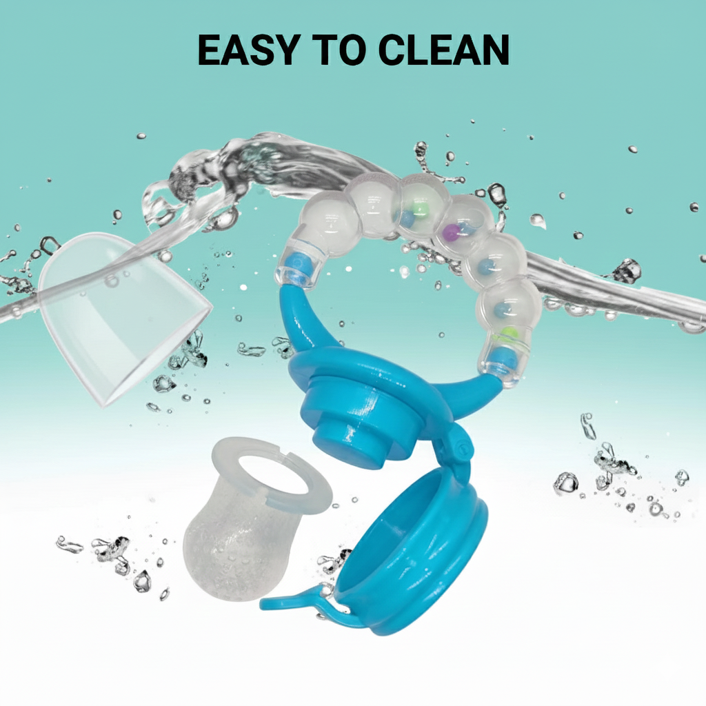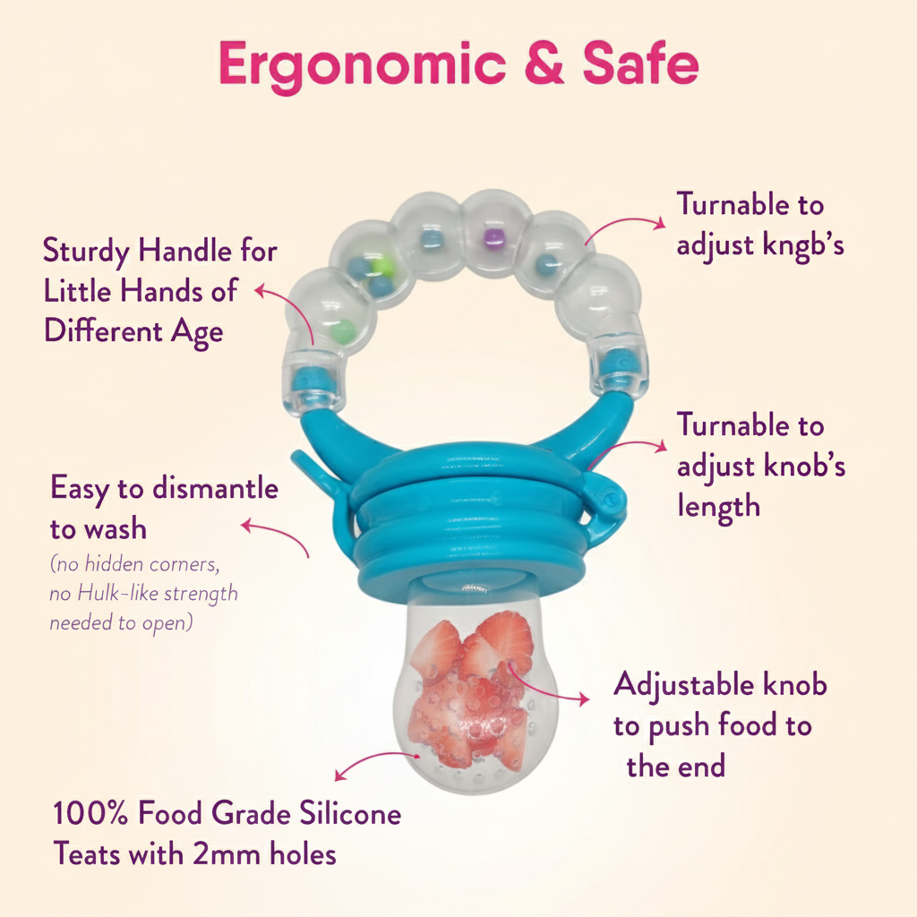 When your baby chews on the textured silicone, it massages their gums. Expert Tip: Put a small piece of frozen fruit or an ice cube made of breastmilk inside. The coldness numbs the gums and provides instant relief from teething pain and "khujli" (itching).