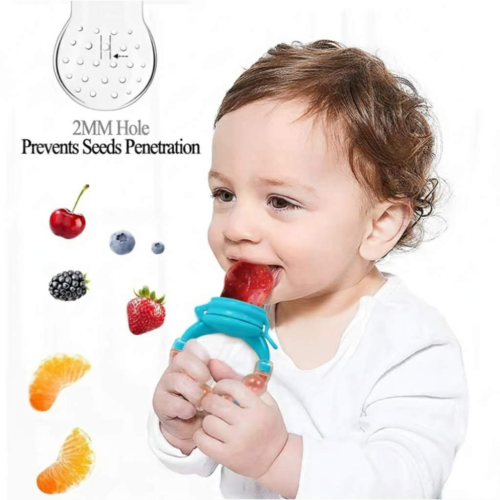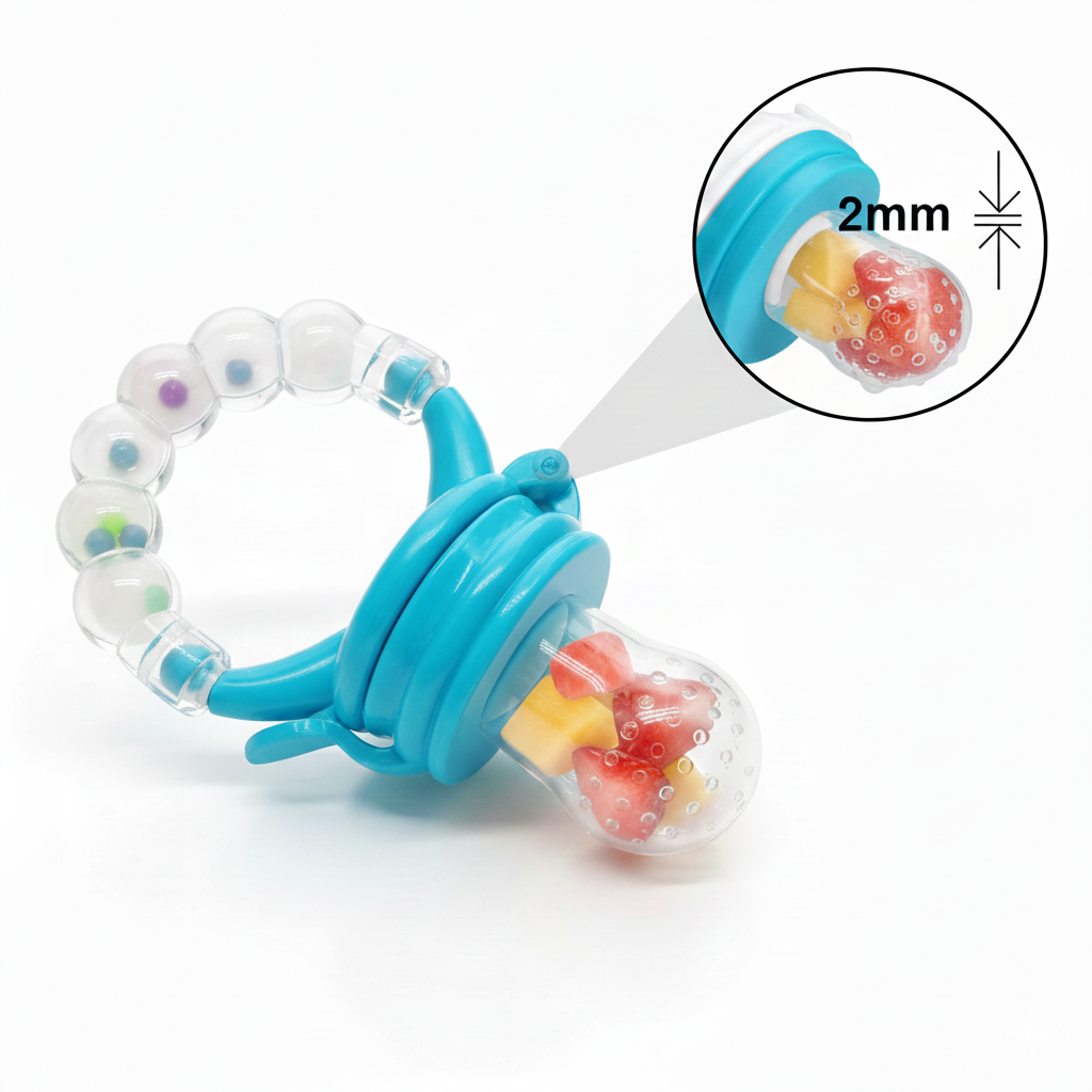 Forget the fear of large food pieces. Our pacifier features micro-perforations that allow only tiny, digestible bits of fruit and juice to pass through. It's the safest way to introduce mangoes, apples, and bananas to your baby while giving you total peace of mind during mealtime.